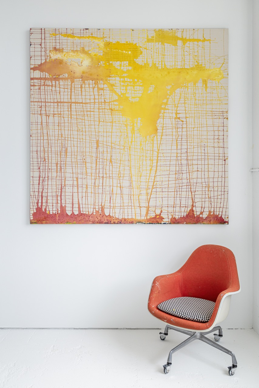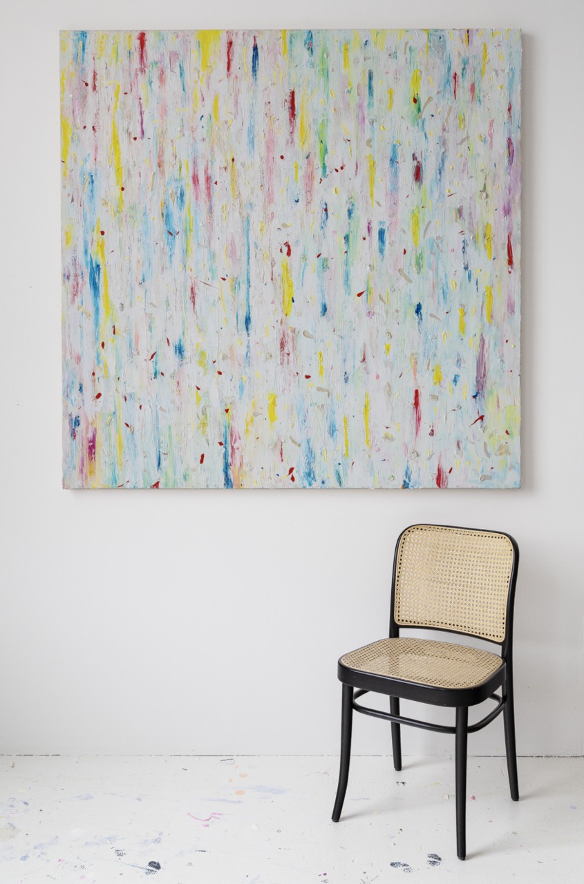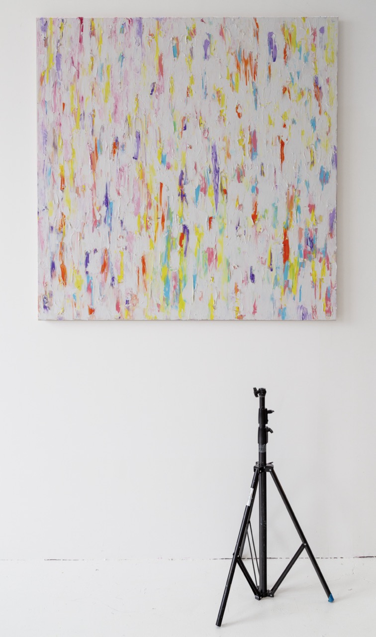 Following graduation, she began painting large scale outdoor murals on the sides of buildings in underdeveloped areas, whereby she developed a technique which underlies and structurally organizes her paintings to this day.